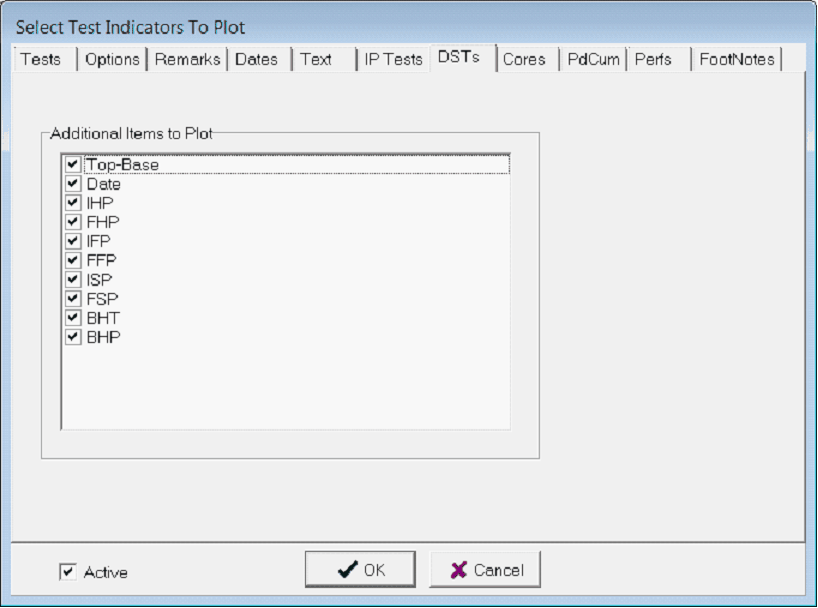 The IP Tests tab controls how DSTs are displayed on the cross section. This tab is only available when the DSTs option is selected on the Tests tab.