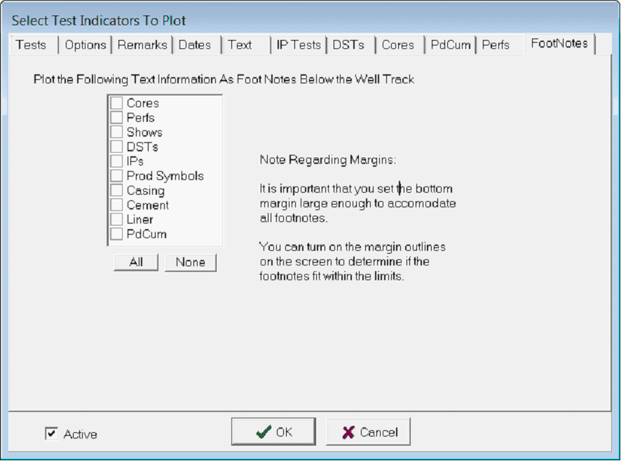 By default, Petra displays text about test indicators along side the test symbol on the wellbore. This option instead plots the test text as a footnote at the bottom of the wellbore.