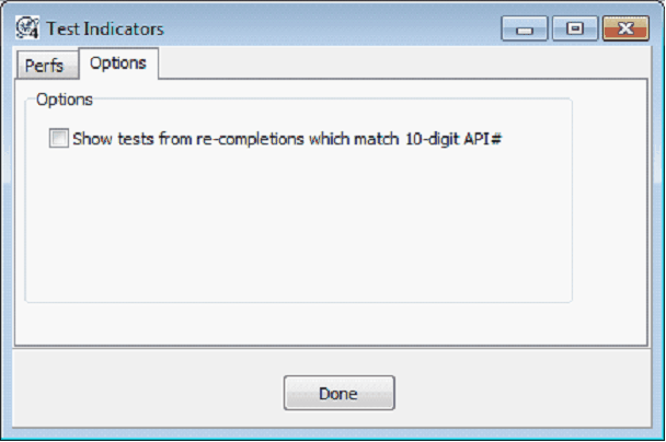 Perfs tabPerf Display Color - This option sets the color for perfs on the Log Correlation Module. Enable Perfs Display - This option enables perfs on the log correlation module. Deselecting this option will remove perfs from the display. Options tabShow tests from recompletions which match 10 digit API - By default, Petra treats recompletions as separate wells. This option forces the Log Correlation Module to use all perfs from all recommpletions that match the first 10 digits of the API number.