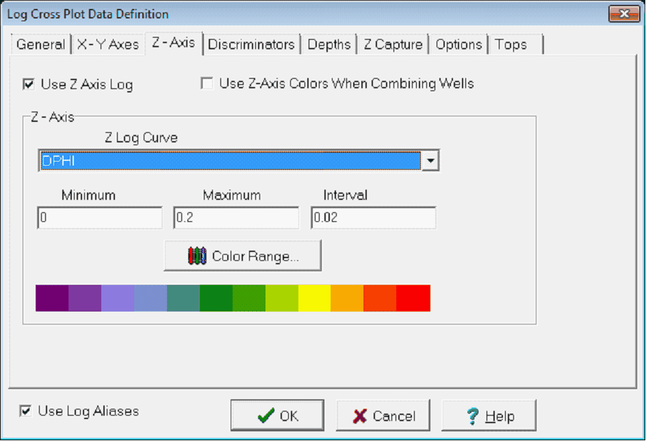 Use Z Axis logThis option simply toggles the selected Z-axis coloring. When toggled on, data points will use the Z-axis colors. When toggled off, Petra just uses the default color for data points, but retains all the color and curve settings for the Z axis. Use Z-Axis Colors When Combining Wells This option overrides the Use different symbol color when combining wells option on the General tab. This section sets the curve and Color bar for the data points. Select the desired curve on the dropdown, and set the scale using the Color Range button.