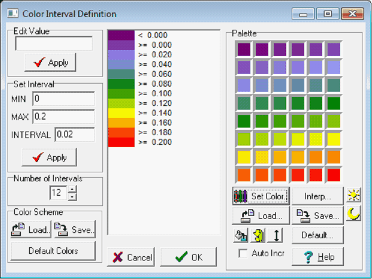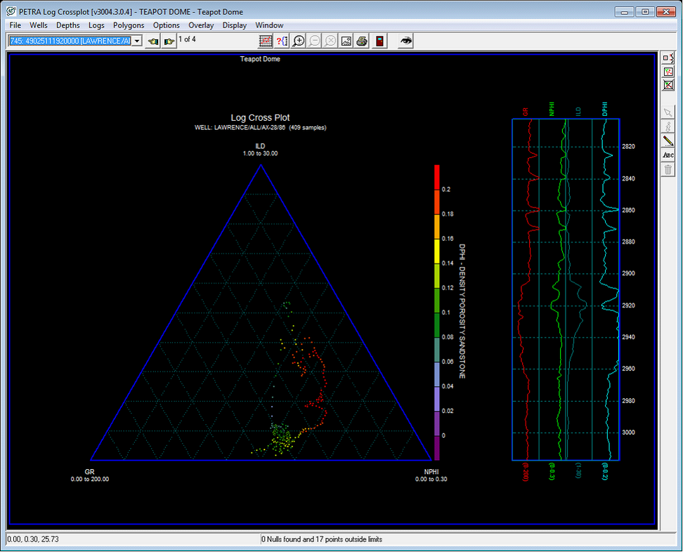 Here, set the minimum and maximum values for the contours in the MIN and MAX boxes. The Interval sets the contour interval between colors. There can be up to 47 different intervals. Petra comes with several other color schemes available through the Default button on the right side of the screen. The example above uses rainbow.zpl. To create a new color scheme, select an individual interval and select a color from the palette for that interval. The two examples below demonstrate how Z data can add an additional dimension to log cross plots. The first example colors a gamma and deep resistivity cross plot by density porosity values. Cool sandy data points tend to correlate with higher porosity, with the notable exception of an island of high resistivity tight streak in the upper left corner of the plot. The second example shows a gamma ray, resistivity, and neutron porosity ternary cross plot with data points colored by density porosity. This plot reaches similar conclusions as the first, with the added conclusion that neutron porosity and density porosity are closely related.