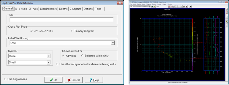 The Log Cross Plot module graphically compares two different log curves on an X-Y scatter plot to help identify the log response to lithology. Color-coding the data points can show an additional third variable on the scatter plot. launching the Log Cross Plot module brings up the “Data Definition” screen superimposed over the main Cross Plot Module, both of which are blank by default.