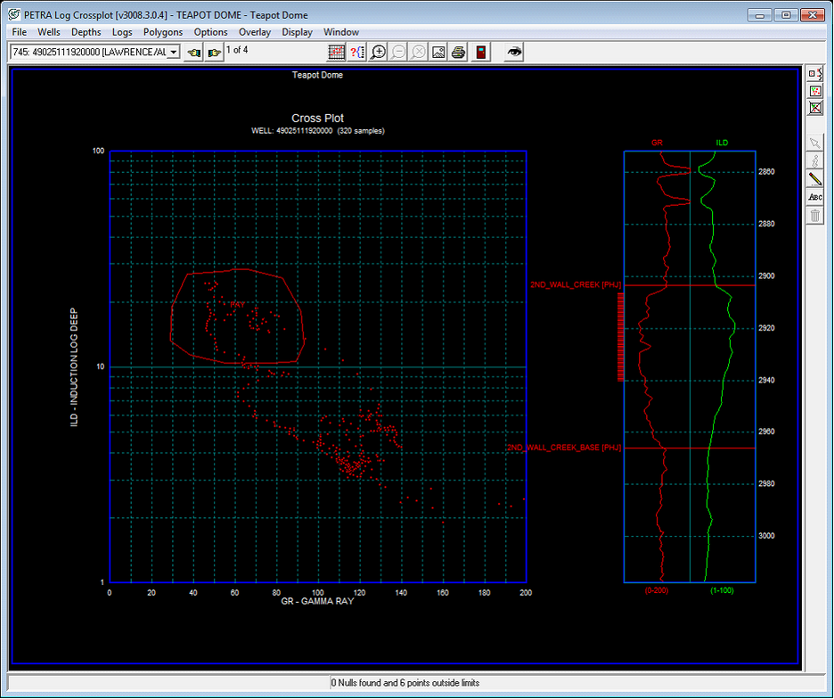 The example below shows a Gamma/Resistivity crossplot with a single pay polygon. This polygon covers the data points where gamma is lower than about 90 API units and resistivity is above 10 ohmm in short, its the potentially productive sand. Its facies value is 1. On the curves to the right, the data points inside this polygon are highlighted in red. Footage-wise, its from about 2905 to 2940 MD.