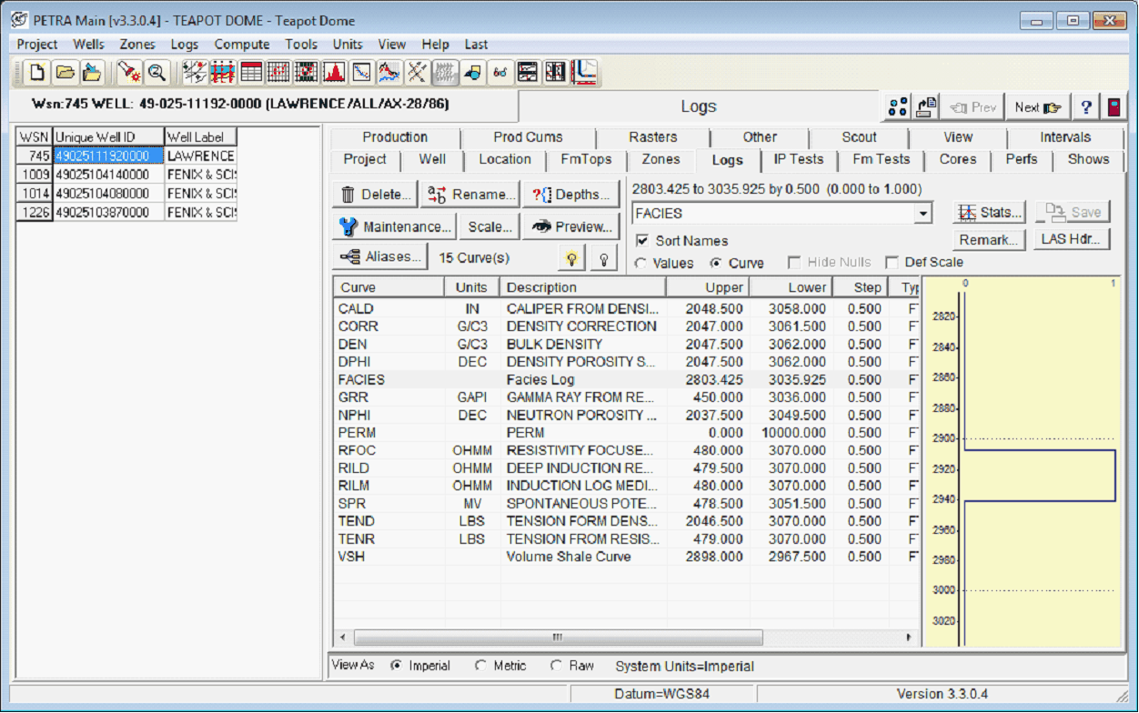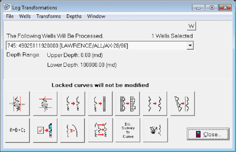 Setting the Wells and Depths in the Log Transformations BoxFirst, select the desired wells and depths in the Log Transformations Module with Wells>Select. Current Well From Main selects the single well currently selected in the Main Module. All Wells selects all wells available in the project. By Data Criteria selects wells based on a set of nested criteria including well headers, logs, or zone data. Wells From Main selects all wells currently selected in the Main Module.