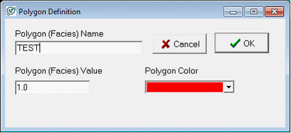 Once the polygon is picked, Petra brings up the Polygon Definition box. Here, simply enter the name of the polygon or facies, pick a color, and add a polygon facies value. The facies name is be the only way of distinguishing the polygons apart when calculating a facies curve, so spending time on descriptive names is a good idea. This facies value is the numerical code used when making facies curves, so make sure every facies has a unique value.