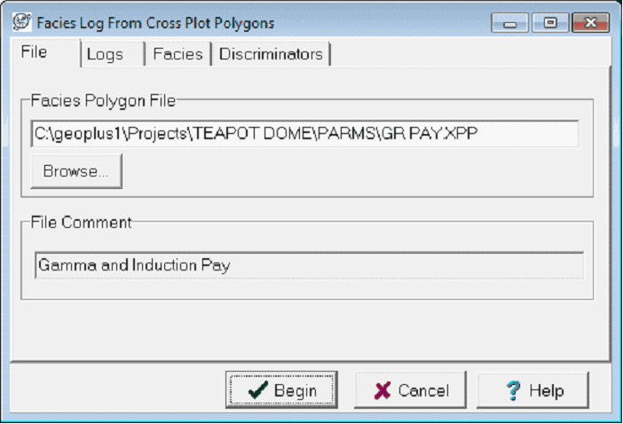On the File tab, the Facies Polygon File entry box should be populated with the selected facies polygon file. The File Comments entered when saving will be shown below. To select a different facies polygon, select the Browse button.