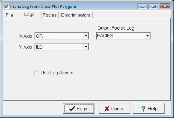 The Logs tab sets the logs used in the facies curve calculation. To change the logs used in the crossplot calculation, select the desired curves on the X-Axis and Y-Axis dropdown boxes. Note that changing the logs will keep the polygon cutoff values the same. If using log aliases in the project, make sure to select the Use Log Aliases checkbox. This window also changes the name of the output facies curve; by default this is set to FACIES as in the example below. To change the name, just enter in a new curve name.