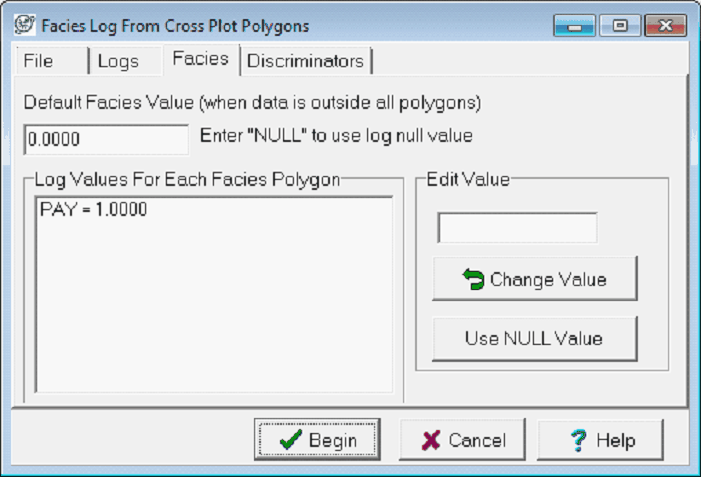 The Log Values For Each Facies Polygon window lists each of the polygon names along with their respective facies values. The values shown are initially populated by each polygons facies value created in the Log Crossplot Module. To change a polygon, select the polygon name on the list, and change the value on the Edit Value box. Select the Change Value button to accept the changes. In the example below, depths where the gamma ray and deep resistivity fall into the PAY polygon will be coded as 1 on the facies curve, while all other depths will be set to zero.