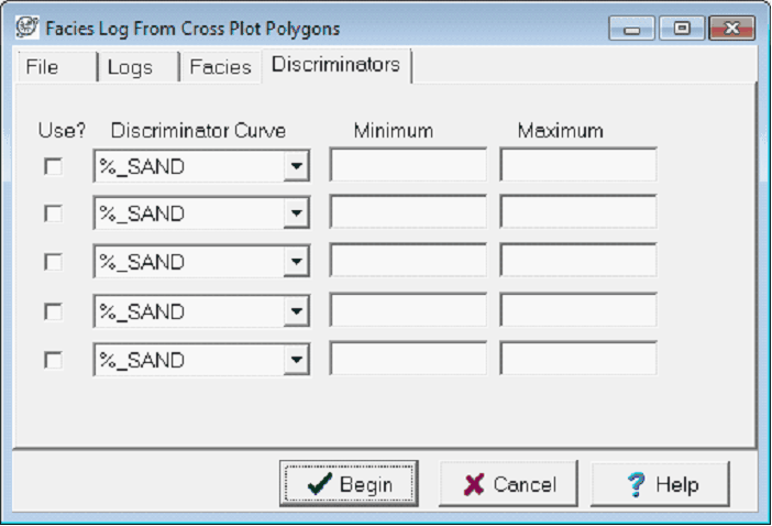 The Discriminators tab filters data points by log criteria. To set a discriminator curve, select up to 5 curves and set the scale using the minimum and maximum entry boxes. Data points that fall outside of these data criteria are not included in the facies curve and will be given the default facies value entered on the Facies tab.