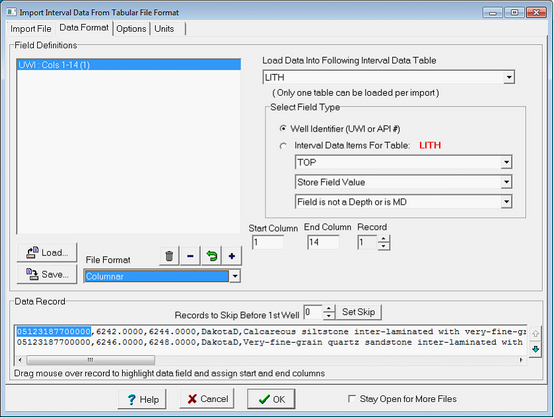 To save the field definitions and options, select the Save button. This option saves a *.FMI file. Selecting the "Load" button restores all the saved settings. Most data files have some header or comments at the top. The Records to Skip Before 1st Well option tells Petra to skip a set number of lines before importing any well data. Click the "Set Skip" button to set the number of skipped records based on the record currently in the data record window, |