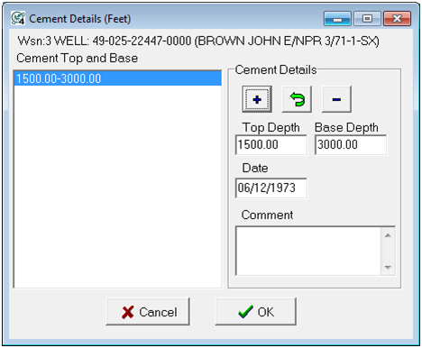 Top - This entry sets the top of the cement. Base - This entry sets base of the cement. Date - This sets the date of the cement. Comment - This entry stores remarks or comments about the cement. |