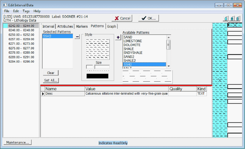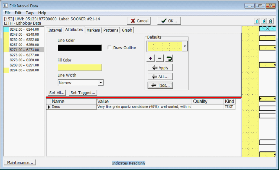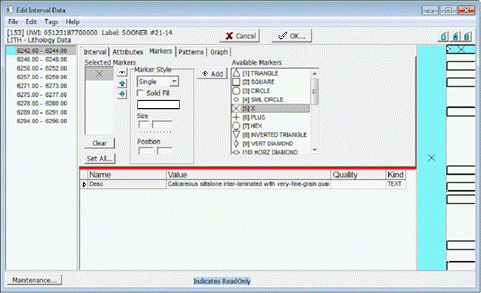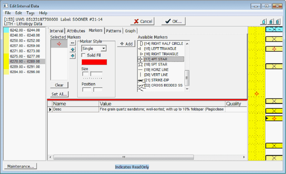 Even after adding default schemes, its easy to go back and modify individual intervals to display different information. In the previous example, three different default schemes reflected lithology and grainsize from core descriptions. To carry this example one step further, markers can also be added to signify porosity. Recall that for the sandstone/siltstone, an X marked low porosity. To add markers for an individual interval, select the interval and go to the Markers tab. Select the marker and the markers color, and select the