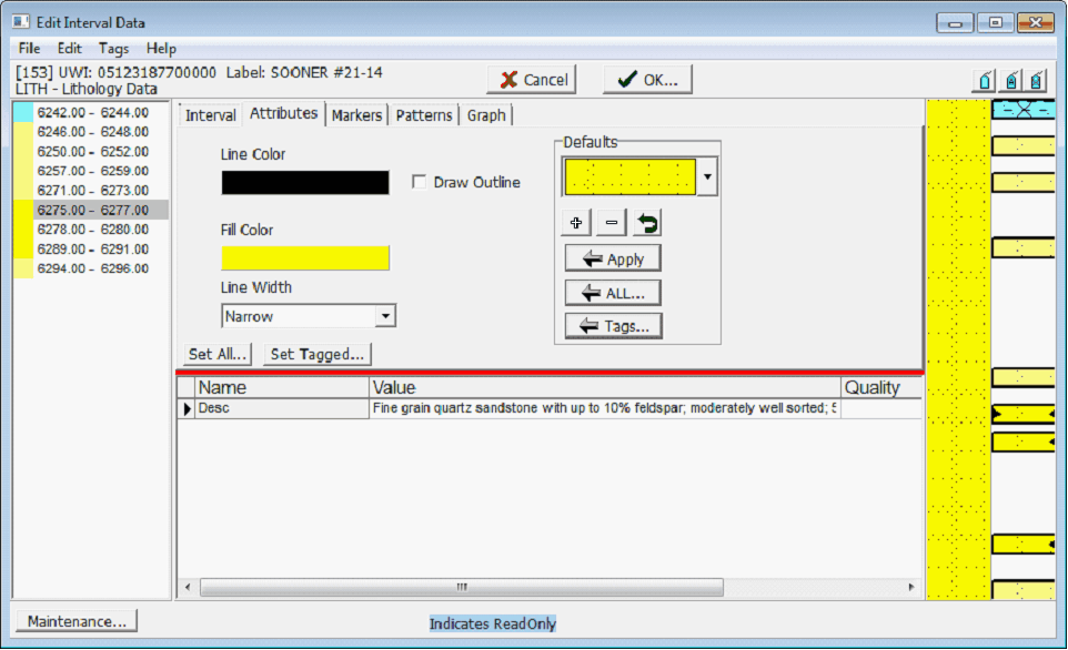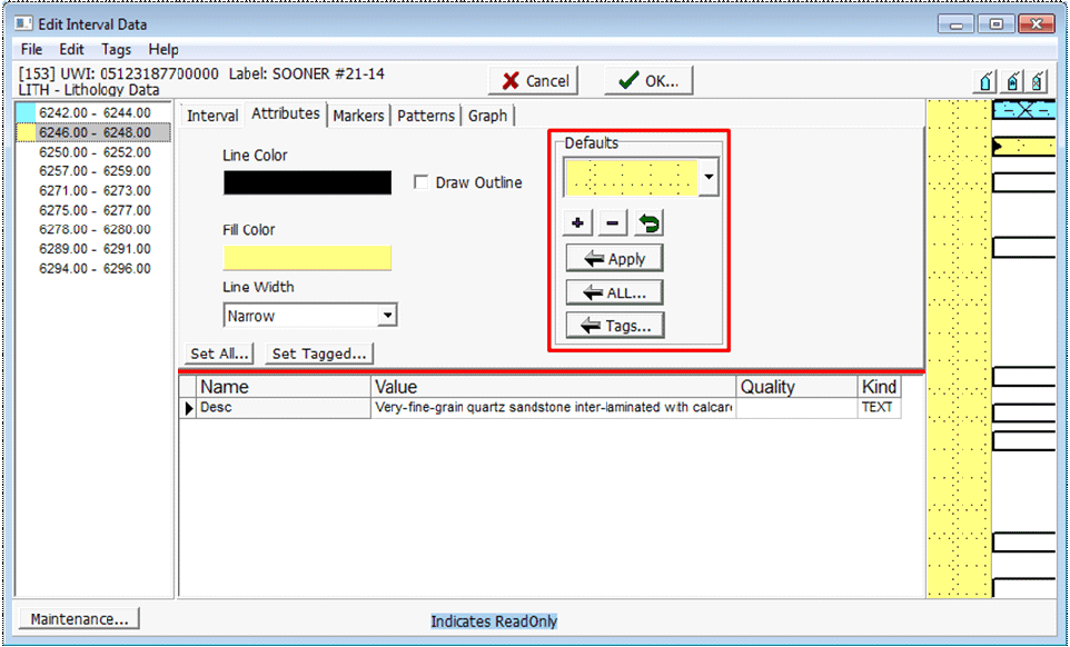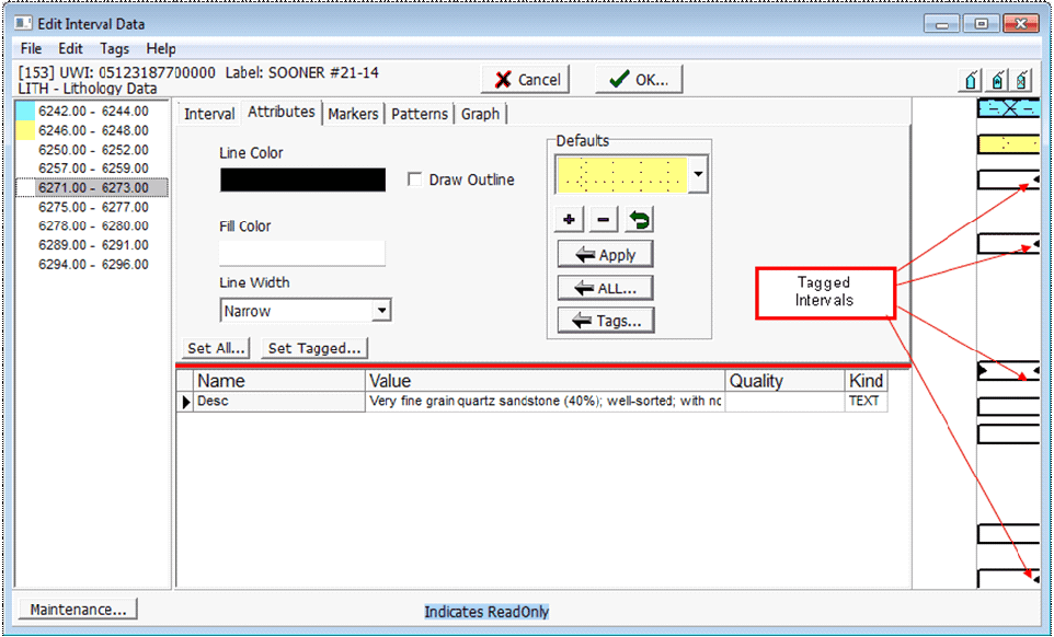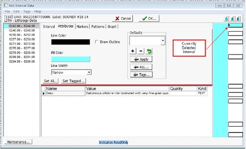 Setting Multiple Intervals Attributes, Markers, and Patterns in a Single WellFirst set a single interval to the desired attributes, markers, and patterns. Next, select the