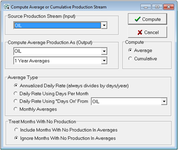 Controls how the tool handles months missing production. This tool can treat the missing production as zero production (which will bring the average down) or skip the month (which will ignore it's effects on the average). Put another way, this is the decision to treat a missing value as a zero or null, and will be affected by your database.