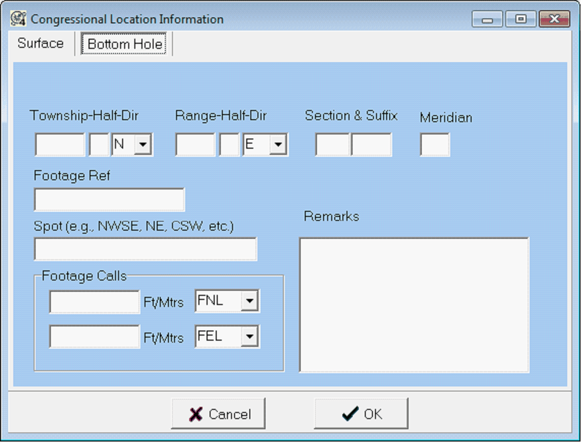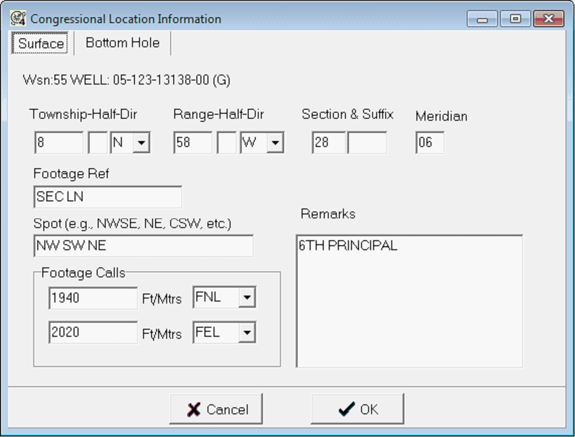 The Congressional Location Information screen establishes a wells surface and bottom hole location with the Township and Range System