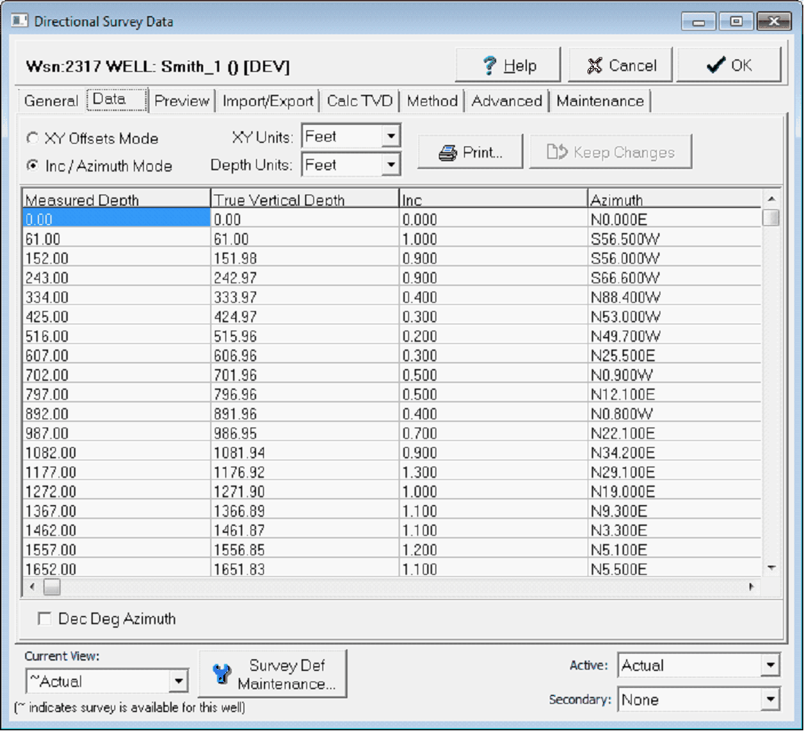 The Directional Survey Data's Data tab showing the well's individual survey points. XY Offsets Mode and Inc / Azimuth ModeData values can either be viewed and edited by MD, TVD, INC, and AZI in "XY Offsets Mode" or by MD, INC, EW, NS in Inc/Azimuth Mode. Petra will compute EW and NS offsets from entered inclination and azimuth data but will not compute the inclination and azimuth from offset data. From a users perspective, changing the offset data deactivates inclination and azimuth data. Modifying each points MD, INC, and AZI gives a little more flexibility later Note that Petra can display or import azimuth data in either the formatted or unformatted convention (e.g. N25E or 25). By default, Petra displays the formatted convention. Selecting the Dec Deg Azimuth button instead shows azimuth in the unformatted convention. XY and Depth UnitsSet the "XY Units" and "Depth Units" combo boxes to indicate the units of the survey data. Note that this option does not convert the data at all it just tells Petra whether the numbers used are in feet or meters. Adding and Modifying Data in the Data WindowMoving around in the data spreadsheet is similar to other spreadsheet programs. The arrow keys, clicking in different cells, and the tab key all navigate through the data spreadsheet. To add a new row, select the down arrow on the last row or press tab or enter keys in the last cell of the last row. To insert a row above the currently selected row, press the Alt and Insert keys simultaneously or right-click the mouse and select "Insert New Row." To delete the currently selected row, press the Alt and Delete keys simultaneously or right-click the mouse and select "Delete Current Row." After making changes, select the "Keep Changes" button to update the database.