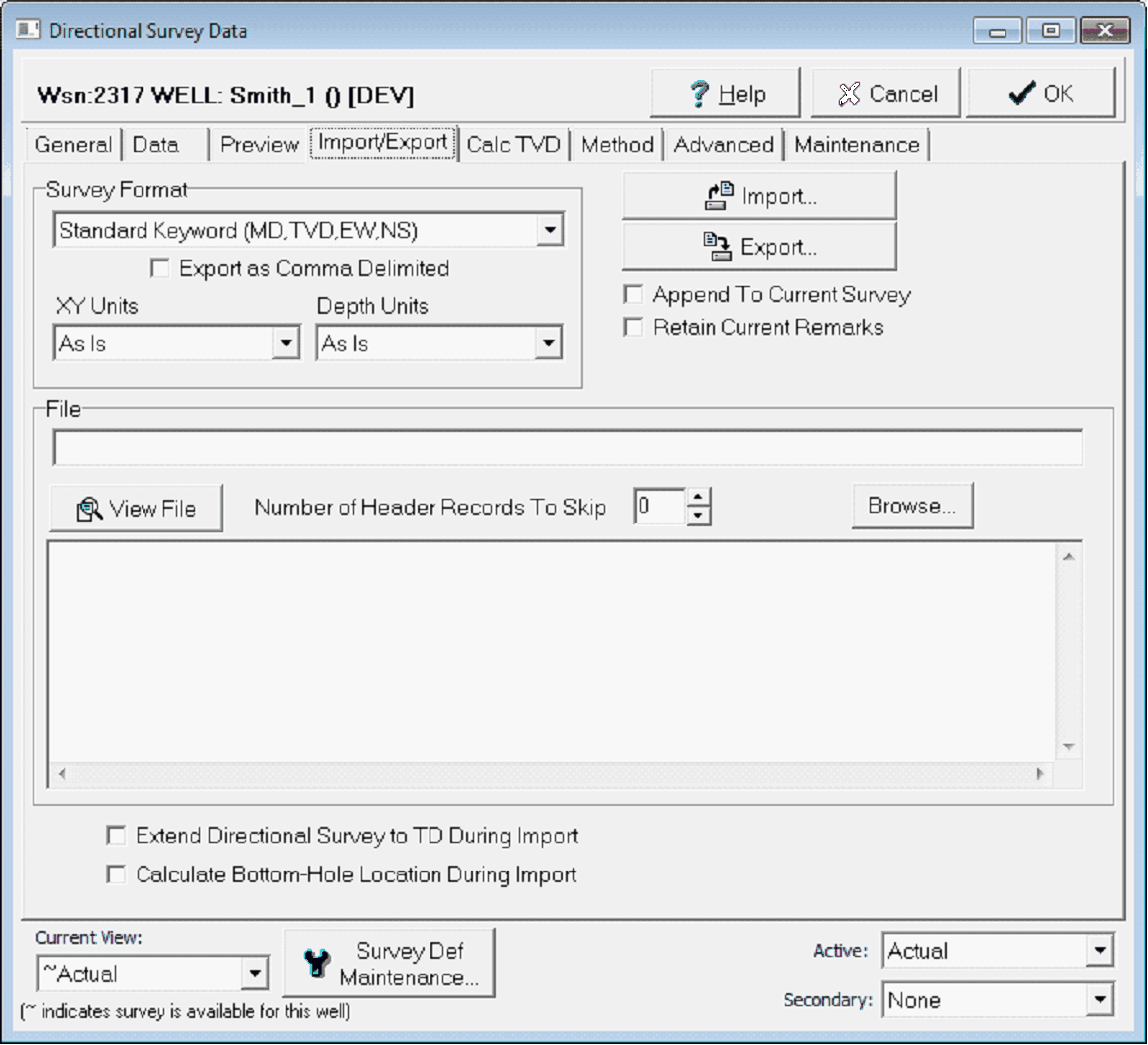 0.00 0.00 0.00 0.00 1.00 1.00 12.44 24.47 100.00 99.00 41.55 80.67 200.00 190.00 76.19 140.90 500.00 450.00 109.42 184.71 1000.00 996.00 165.02 235.52 2000.00 1990.00 208.90 263.81 4200.00 4000.00 240.02 283.86 5000.00 5000.00 288.00 322.65 6000.00 5990.00 309.35 339.45 When exporting data, set the XY units and Depth units to whatever units you want the exported file to contain regardless of the actual units of the survey. Petra will make the appropriate conversions. Extend Directional Survey to TD During Import - This button projects the survey data out to TD using the dip and azimuth of the last survey point. Calculate Bottom-Hole Location During Import - This button recalculates the BHL based on directional survey data. |