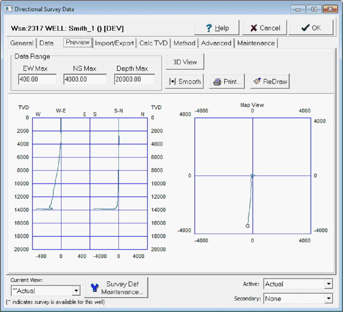 The Preview tab displays projections of the wellbores path in three different planes: EW vs. depth, NS vs. depth, and a map view. This tab also opens a 3D visualization box with the outline of the wellbore.