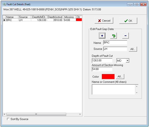To add a new fault cut, enter the desired information and select the "+" button. To drop an existing fault cut, highlight the desired fault cut and select the "-" button. Name - This entry sets the fault cut's name. Source - This entry sets the fault cut's source. Generally this will be the user's initials. Depth of Fault Cut - This entry sets the depth of the fault cut. Note that this depth can be in MD or TVD. Amount of Section Missing - This entry sets the amount of section missing. Color - This sets the color of the fault cut. To change the fault cuts's color, select the colored box. All - This option applies the currently selected color to all fault cuts in the well. Name or Comment - This entry stores remarks or comments about the fault. |