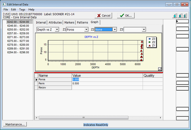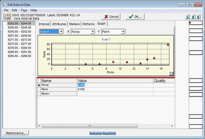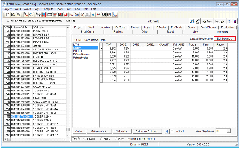 Petra can plot any numerical interval real value versus depth or another real value. This can be particularly useful for quickly seeing how a quantity such as mud weight changes with depth, or understanding the relationship between two different kinds of data like porosity and permeability. To view an interval graph, first select the correct well in the Main Module. On the Interval tab, select the right interval table. In the example below, the CORE table is selected. Finally, select the Edit details button in the upper right on the Interval tab.