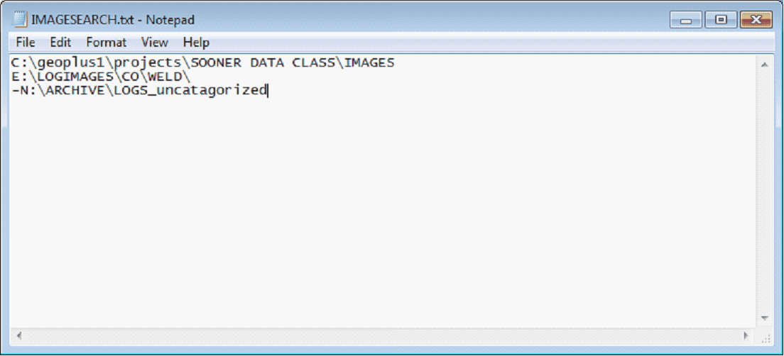 An example of IMAGESEARCH.TXT Creating an ImageSearch.TXT fileFrom the Main Module: 1.Click the Raster tab. 2.Click the Group Maintenance button. 3.Select the Misc & Tools tab. 4.Click the Image Search.txt button. 5.Click the Select Search Folder button and navigate to the desired path location. Click, Select Folder to add path to the list. Repeat this step until all locations have been added to list. 6.Exclude subdirectories from being searched by highlighting individual paths and then check the Search Folder Only checkbox. 7.Click Save. Note: The ImageSearch.TXT file is saved to the current project image directory. Resolving Image PathsOpen the Project in Petra. When the project finishes loading, Go to the Rasters tab, select a raster group in the list and click on Assign/Calibrate. If the raster image opens correctly, proceed to the next step in your workflow, if not, troubleshoot the IMAGESEARCH.TXT file and the paths associated with the raster images. From the Main Module: 1.Click the Raster tab. 2.Click the Group Maintenance button. 3.Select the Misc & Tools tab. 4.Select "Resolve Image Paths" from the Misc Maintenance Tasks drop down list. 5.Click the Perform Selected Task button. If the raster image opens correctly, proceed to the next step in your workflow, if not, troubleshoot the IMAGESEARCH.TXT file and the paths associated with the raster images. Deleting the ImageSearch.TXT fileOnce the image file paths are updated you should delete the ImageSearch.txt file. From the Main Module: 1.Click the Raster tab. 2.Click the Group Maintenance button. 3.Select the Misc & Tools tab. 4.Click the Image Search.txt button. 5.Click Delete File button and confirm.