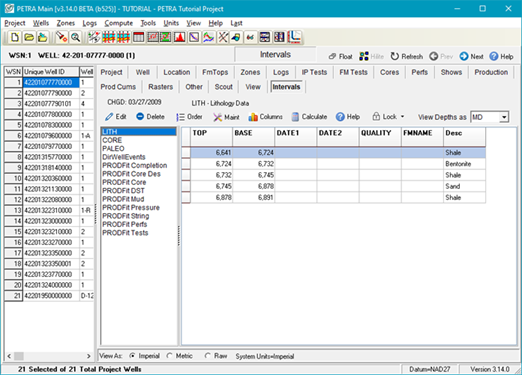 Interval data stores data to a specific depth interval that doesn't fit well with the traditional zone concept, such as data that is too fine (such as core descriptions) or too coarse (such as mud weights or biostratigraphic information) to fit inside two formation tops. Petra stores interval data in tables and fields similar to a spreadsheet. The table stores related interval data in a spreadsheet, where each interval is stored as a separated row. In the example below, the project has the default LITH, CORE, PALEO and multiple PRODFIT tables . Inside the table, each interval is stored as its own row, and information about that interval is stored in fields or columns in that row. All tables come with a few fields, TOP, BASE, DATE1, DATE2, QUALITY, and FMNAME, but you can add user-defined fields containing numbers, dates, or text. In addition to the standard fields, the LITH table in the example below contains the field Desc which stores lithologic descriptions.