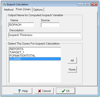 This section lists the names of all user-defined zones. Use the mouse to highlight those zones for which you want the isopach variable computed. The "All" button selects all user-created zones, while the "None" button deselects all zones.