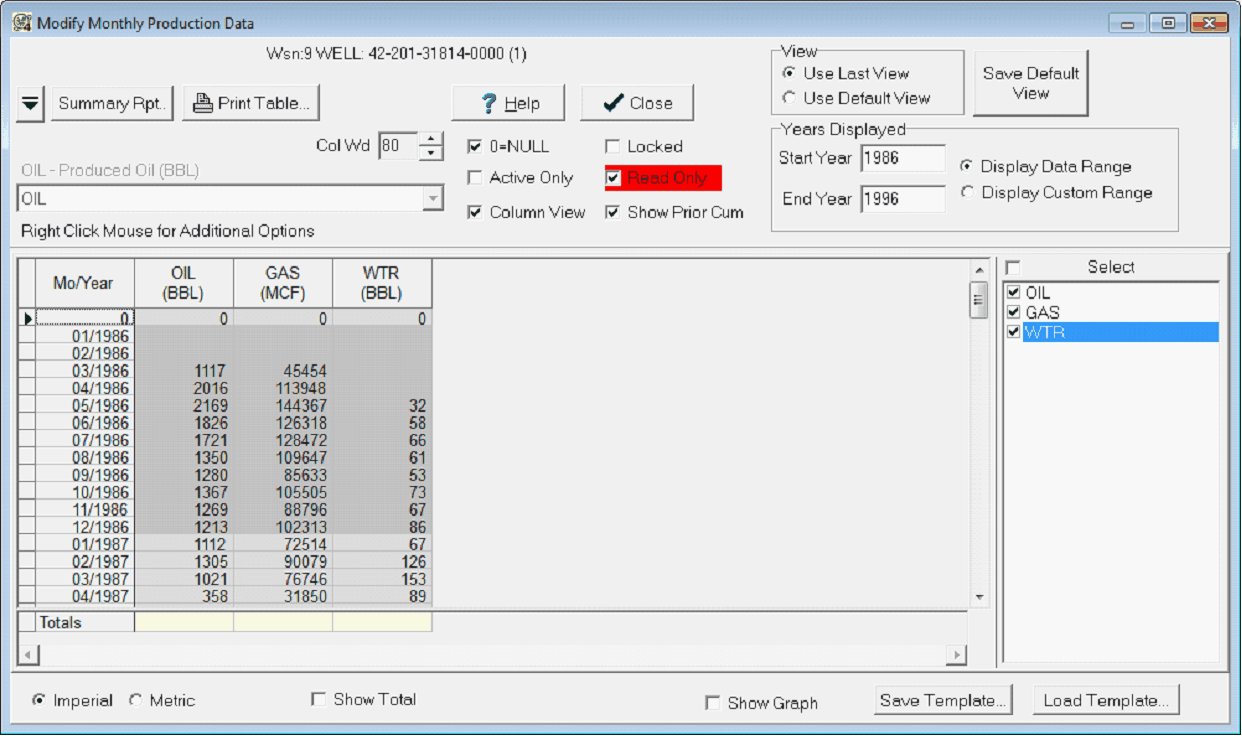 Show Prior Cum - Older wells have production prior to data recording, which is typically stored in the monthly production in a special year "0" entry. This option displays these historical records, which can be important for calculating production cums.