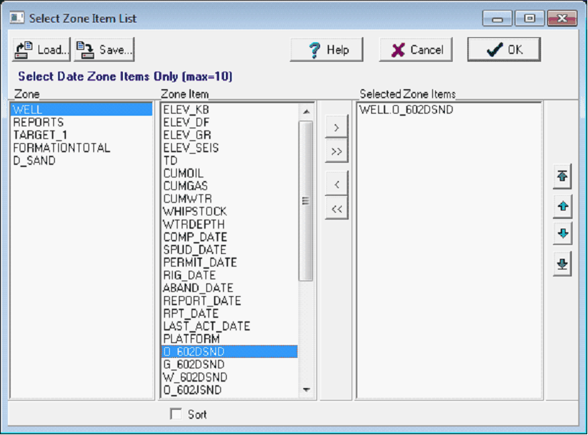 Post Z Data Zone Items on Chart - This option allows zone data items to be plotted on the production chart. Select Zone Items - This button selects the desired zone data items for display on the production chart. Here, select the desired zone and data item on the first two lists, and selec tthe ">" button to bring the data item over to the "Selected Zone Items" list.