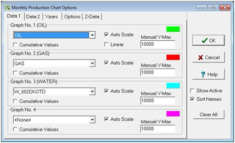 The Prod 1 and Prod 2 tabs set the production data shown on the production chart. |