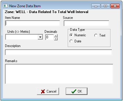 Item Name - This entry sets the name of the new data item. Source - This entry sets a source code for the new data item. Generally, source cores designate the user creating the data item or the method used to create the data item. Units - This dropdown sets the units for the new data item. Decimals - This entry sets the number of decimals for the data item. It's sometimes useful to trim trailing digits for easier display. Data Type - This section sets the general type of the data item. Numeric items store numbers with a set of digits, Text items store a string of text, and Date items store a specific date that can be used in minimum and maximum date search. Description - This entry sets the description for the data item. Remarks - This entry sets the remarks for the data item. |