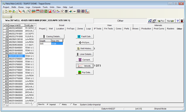 The Other tab modifies additional information on the selected well Fault Cuts - This button opens the Fault Cuts window. Pd Sym - This button opens the Pd Sym tool. Well History - This button opens the selected well's well history, which is a simple *.TXT file. If the well doesn't currently have a well history file, Petra will prompt the user to add one. Liner Details -This button opens the Liner Details window. Cement -This button opens the Cement Details window. Velocity - This button opens the Depth-To-Time Functions window. Pay Data - This button opens the Pay Interval Data window. |