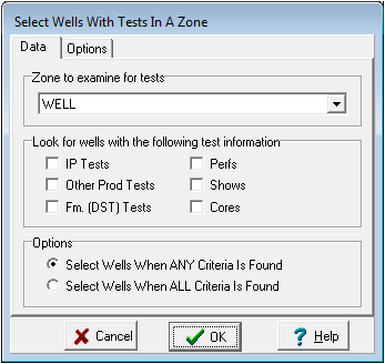 This well selection option will examine a selected zone interval for the occurrence or one or more data criteria consisting of IP or production tests, formation tests (DST), perfed intervals, cored intervals, and shows.
