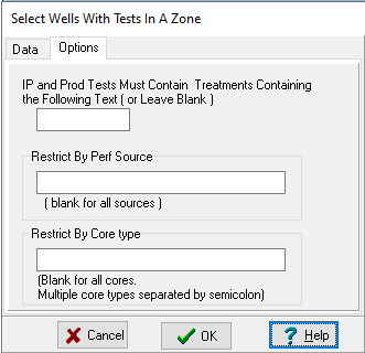 Zone to examine for tests - This option searches for wells that have tests inside the top and base set by the the selected zone's interval definition.