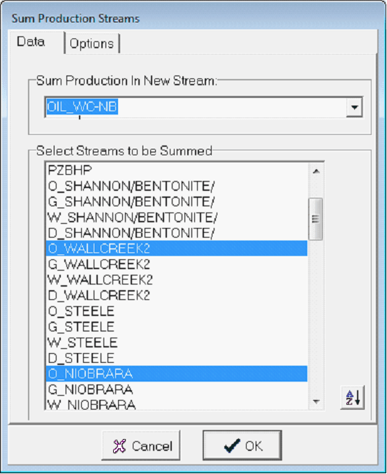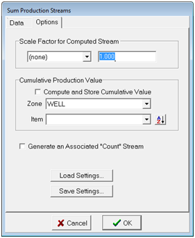 Data tabSum Production in New Stream -This dropdown selects the production stream that will contain the sum. Select an existing production stream or enter a new name. Note that selecting an existing production stream will overwrite the production stream in the database. Select Streams to be Summed - This list selects the production streams to sum together. Use SHIFT to select multiple successive streams, or CTRL to select streams individually. Options tabScale Factor for Computed Stream - This option multiplies or divides the production stream by a constant. This can be useful for changing the production stream's order of magnitude. The default "(none)" option does not change the data. Cumulative Production Value - This option stores a cumulative production value to a selected zone data item. Generate an Associated "Count" Stream - This opten creates a count stream that stores the number of streams contributing to the summed production. Petra will store a stream that appends "_CNT" to the name of the new stream. In the example above, the count stream will be named "OIL_WC-NB_CNT"
