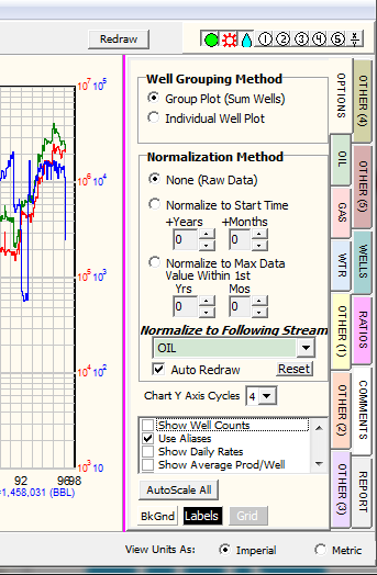 ·Normalize to Max Data Value Within 1st Adjusts all production to a starting time at the maximum value of a selected production stream within a time frame. This is useful to time-normalize wells that take a variable amount of time to reach full production. As an example, if this option is selected with maximum OIL production in one year, Petra will find the month with maximum oil production within the first year and set that as the start time (0 on the X axis). Average production plotted against elapsed time after a single starting point gives an average well or type curve production. The cumulative production values at the bottom of the screen do not include the data truncated by the normalization, and reflect only the data after the maximum value.