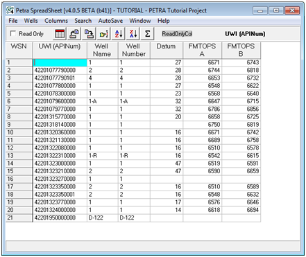 The spreadsheet tool allows you to edit data from the database in spreadsheet format. Spreadsheet columns are made up of selected well header or zone data values. Options include copying, sorting, computing statistics, find/replace, among others.