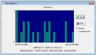 Column StatisticsA statistical histogram can be displayed for numeric data columns. Click any data cell of the desired column and choose the "Show Stats" menu of either the "Columns" menu or the pop up menu invoked with the right mouse button.