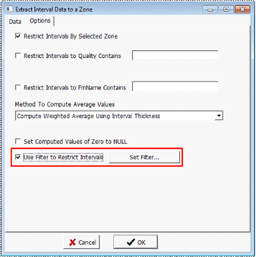 Not Equal to Value Equal to NULL Not Equal to NULL Value in Range Field Contains String Interval Thickness in Range eliminates intervals that are thicker or thinner than a given range. Finally, select the Add button to add the filter to the Current Filters list at the bottom of the box. In the example below, the filter is set to include only intervals that contain the words, very fine grain