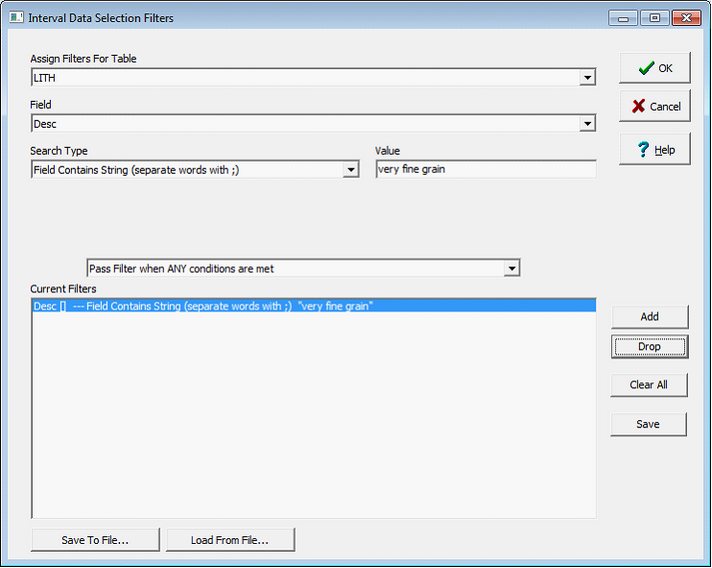 The Interval Data Selection filters can be divided into two parts. The upper half of the screen builds and modifies filters, while the lower half shows the active filters and the pass relationship between different filters. To create a new filter, select the table and field for the filter from appropriate dropdown menus. The example below filters intervals in the LITH table by data in the DESC data field. Next, select the filters Search Type. With one exception (Interval Thickness In Range) the search type tells Petra what the filter should look for inside a field: