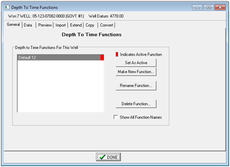 Copy Depth to Time FunctionThis tool copies the active function to a set of wells. This can be significantly easier than manually importing the Depth-To-Time function for multiple wells. Copy and Make It the Active Depth to Time Function - This option copies the function to the wells selected on the "Wells To Receive the Depth to Time Function", and makes it the active function. Copy and Make It the Active Depth to Time Function IF No Active Function Is Set - This option copies the function to the wells selected on the "Wells To Receive the Depth to Time Function", and makes it the active function only if the well doesn't have an active function. Copy Depth to Time Function - This option copies the function to the wells selected on the "Wells To Receive the Depth to Time Function", but does not change any of the settings regarding the active function. Wells with an existing active function will retain their active function. Wells without an active function will just have the copied function in the database; it won't be set to the active function. Make Function Active (do not copy) - This option doesn't actually copy the function from one well to another. Instead, this function sets the selected function to be the active function in wells where it is present in the database. Wells To Receive the Depth to Time FunctionAll Selected Wells - This option will copy the function to all wells currently selected in the Main Module. Wells From WSN List Below - This option will only copy the function to the wells on a WSN list. Select the "Browse" button, navigate to the desired *.WSN file, and select OK. Copy Function from Another Well to This WellThis tool just copies the function from another well. Simply enter the WSN of the well to receive the currently active depth-to-time function, and select the "Apply Function From Other Well." Convert tabThe Convert tab just has a utility for converting depth and time using the currently active function.
