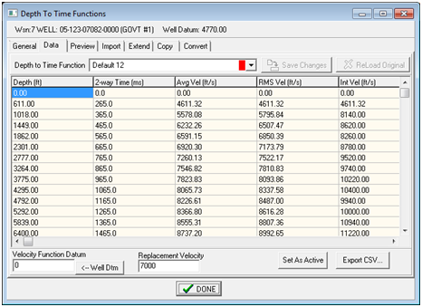 Petra stores depth-to-time functions internally in the project database. This tool adds, modifies, and deletes velocity functions in the project. To open the Depth-To-Time Functions tool, select the "Velocity" button on the Main Module's Other tab. General tab