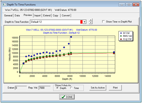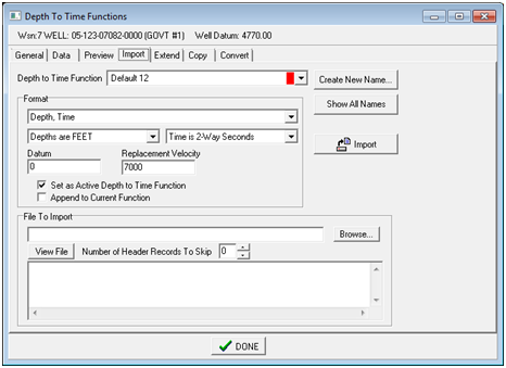 Depth to Time Function - This dropdown selects the desired depth to time function loaded into the project. Show Time vs. Depth Plot - by default, the graph shows interval velocity, RMS velocity, and average velocity. This option instead displays a single time vs. depth plot of the selected function. Show X-Axis As - This option changes the horizontal axis to depth or time. Set As Active - This button sets the currently selected velocity function as the "active" function for the well. Print - This option prints the plot on the screen. Import tabThe Import tab imports new time-to-depth functions and overwrites existing functions with revised data.