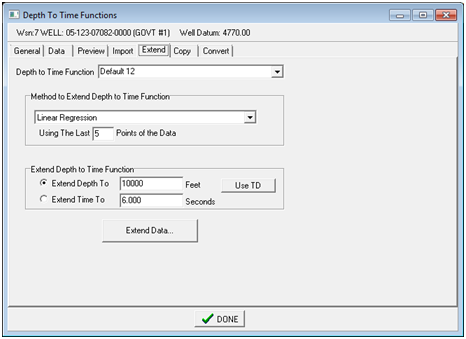 Depth To Time Function - This dropdown selects the location of the loaded time-to-depth function. Selecting an existing function will overwrite the function with the data from the file by default, but the "Append to Current Function" option will instead append new data to the end of the function in the project database. To add a new function name, select the "Create New Name..." button. FormatThe Format Section tells Petra how to load the file correctly. Columns - This dropdown sets the format of the imported file. Options include "Depth, Time", "Time, Depth", "Velocity Databank LAS", and "PetraSeis 'ftn' file." Depths - This option sets the depth units of the depths in the selected file. Time - This option sets the time units of the times in the selected file. Petra can import any combination of seconds/milliseconds and one-way/two-way. Datum - This option sets the datum for the imported file. Replacement Velocity - This option sets the replacement velocity for the imported data. Set as Active Depth to Time Function - This option sets the imported function as the active function for the selected well. Append to Current Function - By default, importing a depth-to-time function into an existing function will overwrite the function with the data from the file. This option instead appends new data to the end of the function in the project database Extend tab