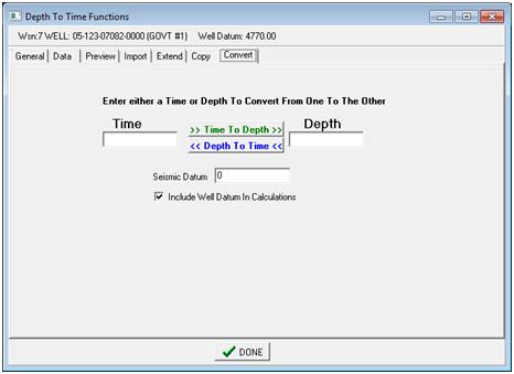 To use this tool, simply enter the desired time or depth, and select the relevant "Time To Depth" or "Depth To Time" button. Seismic Datum - This option sets the seismic datum for the calculations. Include Well Datum In Calculations - This option includes the well's active datum (set on the Main Module's FmTops tab) in the calculation. By default, this is on. |