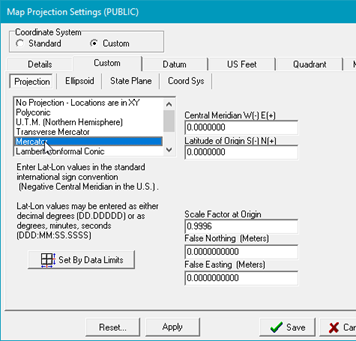 1. On the Projection tab, select the specific projection type and projection parameters such as central meridian.  Petra will accept LatLon values in either decimal degrees or as degrees:minutes:seconds.