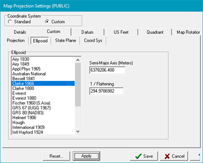 3. On the Elipsoid tab, select the desired ellipsoid. Make sure the projection and associated ellipsoid match the chosen Reference Datum.