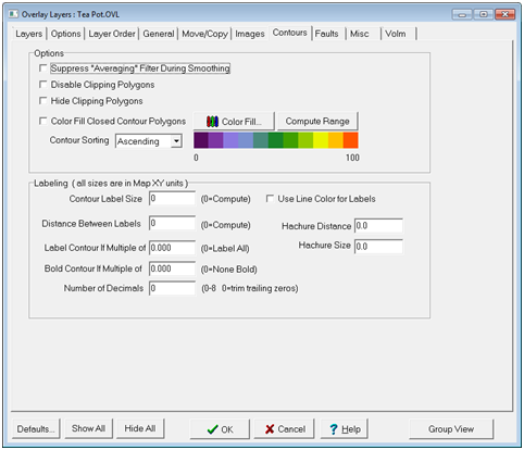 The Overlay Layers' Contours tab OptionsSuppress "Averaging" Filter During Smoothing - Disable Clipping Polygons - This option prevents the Map Module from using clipping polygons Hide Clipping Polygons - This option hides clipping polygons so that they don't show up on the map. This can be useful for plotting out presentation maps. Color FillColor Fill Closed Contour Polygons - This option applies a color fill to all closed contour lines. This is a simpler version of the Color-Fill Overlay Contours tool, which can handle faults and better work with open contour lines. Color Fill - This option opens the Color Interval Definition window to set the individual colors and intervals. Compute Range - This option opens the Color Interval Definition window to set the individual colors and intervals. In contrast to the "Color Fill" option, this tool attempts to automatically calculate a range for the displayed contour lines on the Map module. Contour Sorting - This option selects the sorting order of the contours (Ascending, None, Descending) LabelingContour Label Size -This option sets the height of the contour label in map XY units. When this value is set to "0", Petra will automatically calculate a decent value. Distance Between Labels - This option sets the distance between contour labels in XY units. When this value is set to "0", Petra will automatically calculate a decent value. Label Contour if Multiple of - This option sets a multiple for labeling contour lines. As an example, when this value is set to "5", Petra will only label every 5th contour line. When this value is set to "0", Petra will label all contour lines. Bold Contour If Multiple of - This option sets a multiple for drawing thicker, bold contour lines. As an example, when this value is set to "5", Petra will draw every 5th contour line thicker. When this value is set to "0", Petra will not bold any contour lines. Number of Decimals - By default, Petra trims trailing zeros off contour line labels. This option instead forces Petra to leave additional decimal points on contour line labels. Use Line Color For labels - By default, Petra draws contour line labels in black. This option instead forces Petra to use the line color. Hachure Distance - This option sets the distance between hatchures in XY units. When this value is set to "0", Petra will automatically calculate a decent value. Hachure Size - This option sets the height of the hachures in map XY units. When this value is set to "0", Petra will automatically calculate a decent value. |