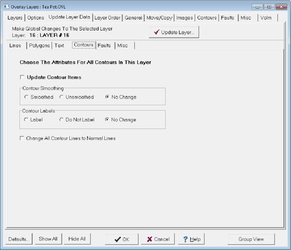 Update Contour Lines - This option allows contour lines in the layer to be updated and changed. Contour Smoothing - This option adds an additional smoothing to contour lines. Contour Labels - This option displays and hides contour line labels for all contour lines in the selected layer. Change All Contour Lines to Normal Lines - This option changes all contour lines in the selected layer to a "Normal Line" line class. This option will erase all the contour line's contour values. |