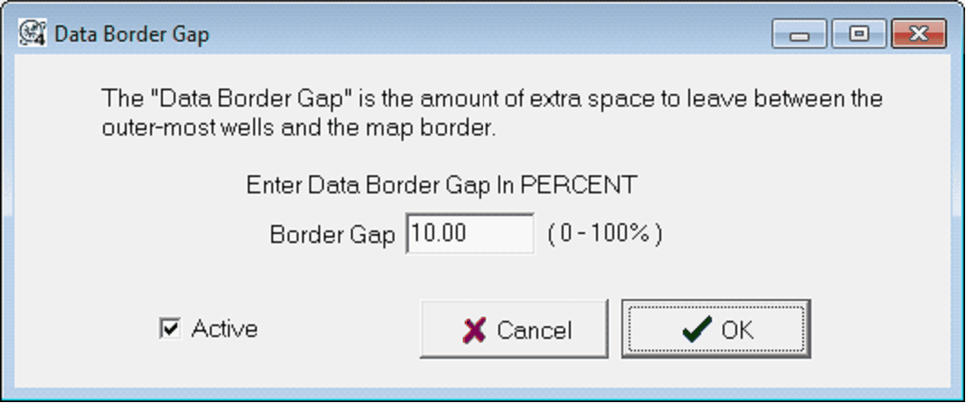 The data border gap establishes a space between the extent of the wells and the border. Without a gap, wells would fall right on the border, making them difficult to see. To establish a data border gap, select Display>Data Border Gap on the menu bar at the top of the Map Module.
